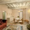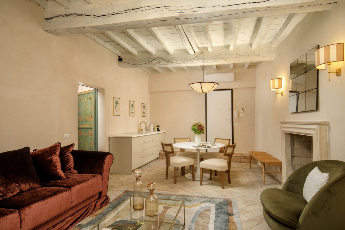 - A living room with a four-seater dining table, a comfortable sofa bed for two, a smart TV, an armchair, and a characteristic Roman travertine marble fireplace.