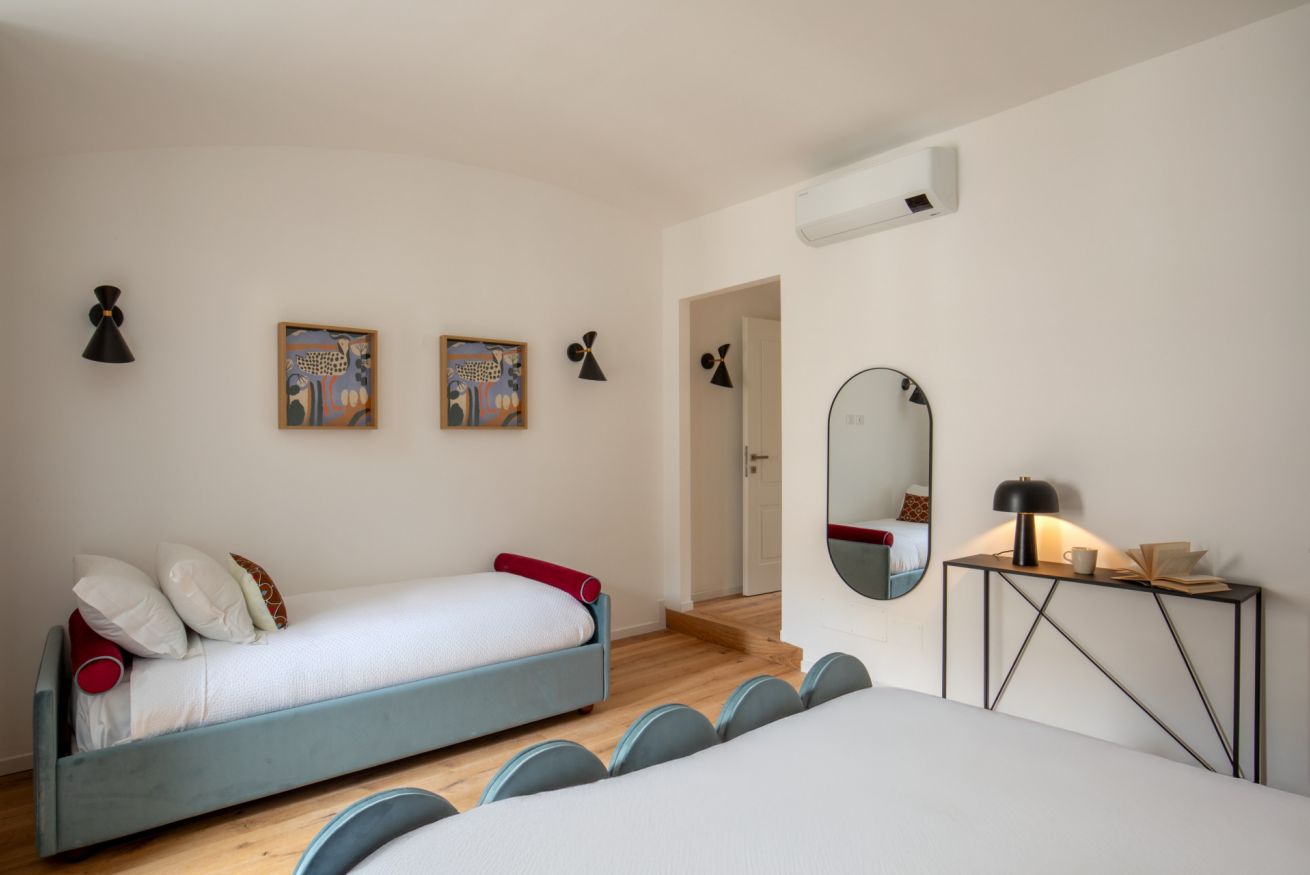 There is also an additional sofa bed, located in the smaller living room between Room N°4 and Room N°5. The main living room is the perfect space to relax, featuring a Smart TV and a comfortable sofa. Please note that the living room is not large enough to comfortably accommodate the maximum capacity of 14 guests. The kitchen is fully equipped with everything you need: a refrigerator, induction stove, plates, cutlery, and wine glasses. Guests will have access to five brand-new bathrooms with showers, hairdryers, and a courtesy kit that includes soap and shampoo, ensuring a quality stay. Indipendent heating system and air conditioning provide maximum comfort in every season. High-speed Wi-Fi is available throughout the apartment, making it an ideal choice for remote workers.