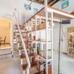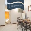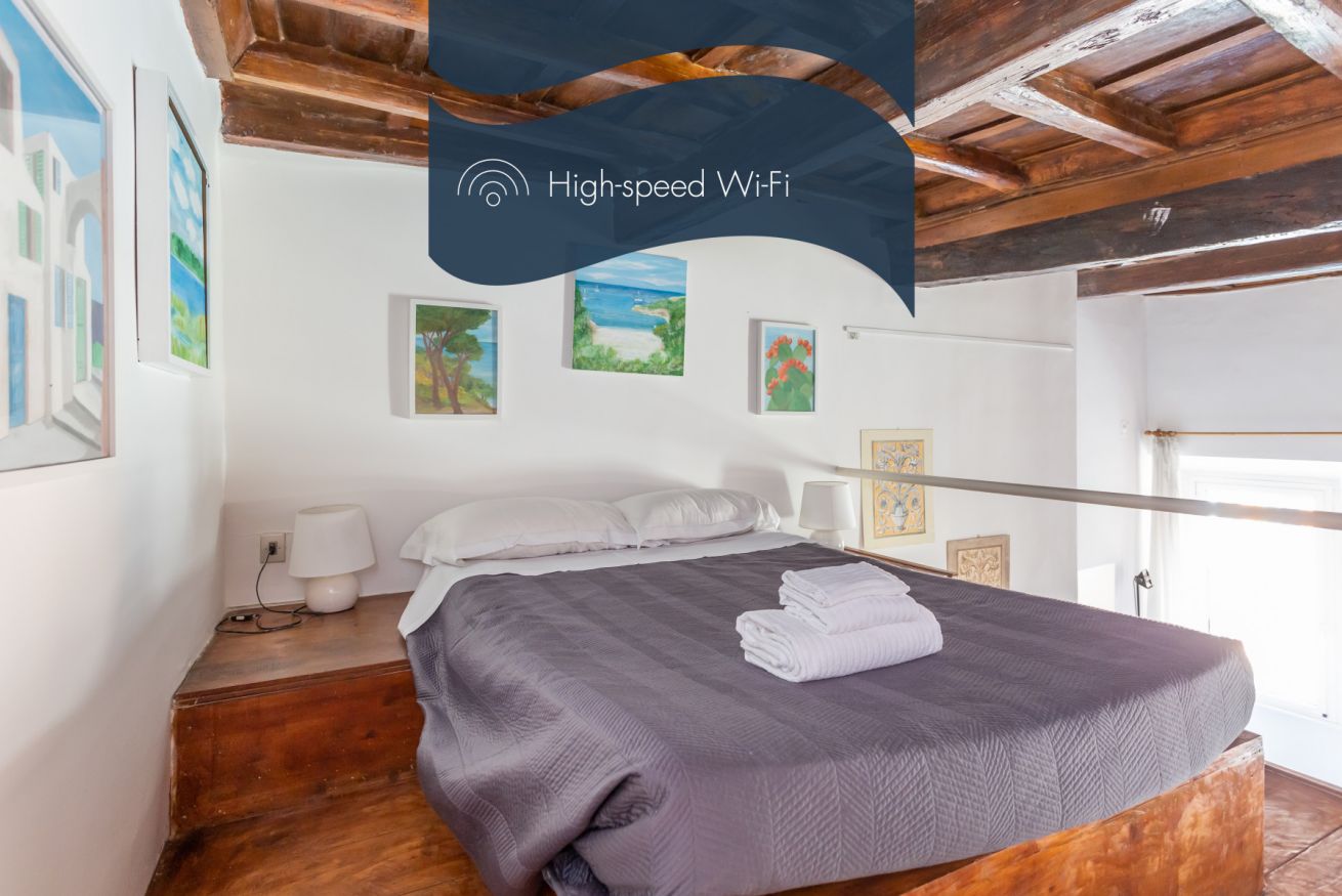 The flat opens onto a bright living room furnished with a sofa, armchairs, desk and a mezzanine with a double bed. You will be impressed by the wooden ceiling, a typical element of historic flats in the centre of Rome.