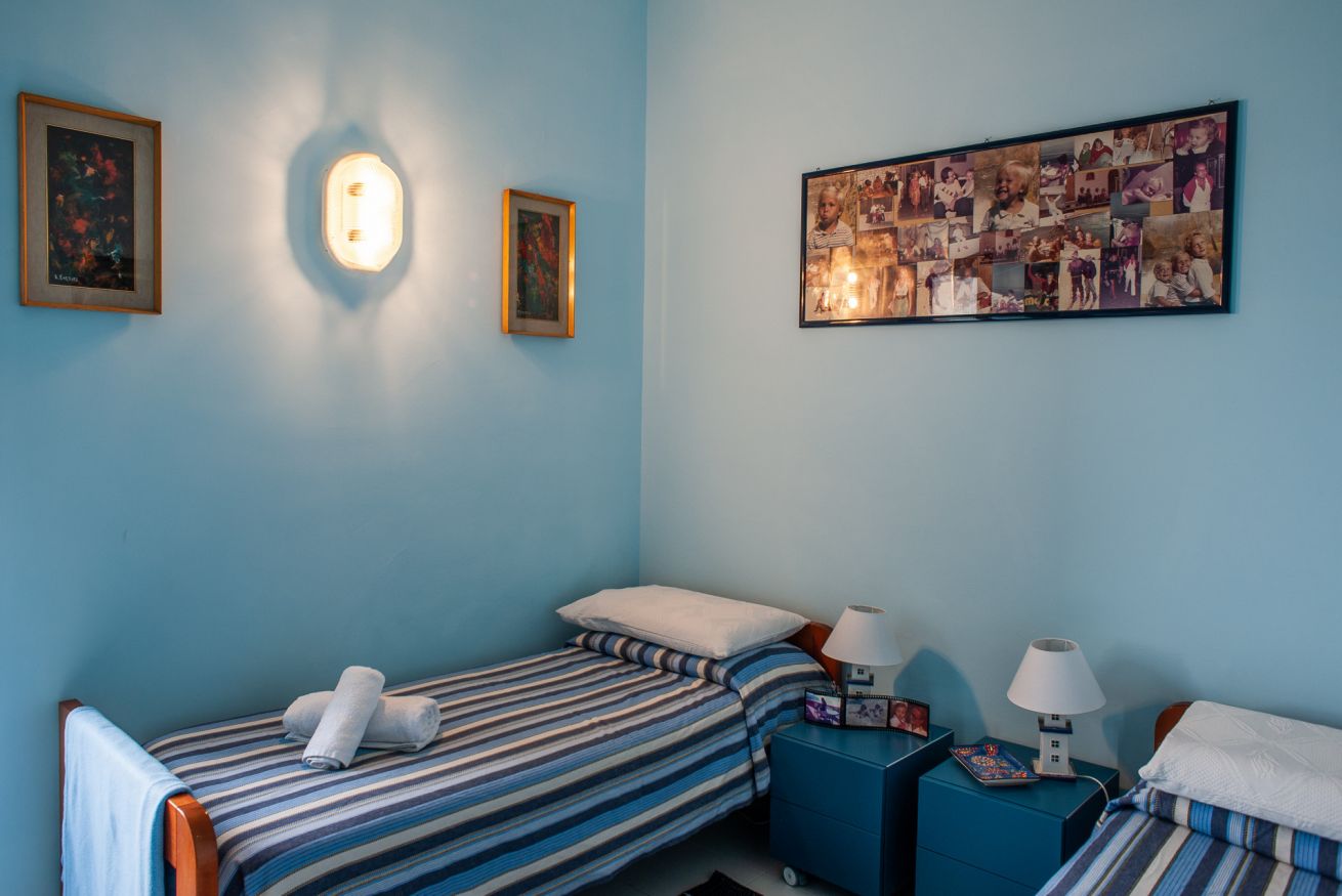 La villa si sviluppa su due piani, collegati ma con ingressi indipendenti, e può ospitare comodamente dalle 8 alle 11 persone. Dispone di 4 camere matrimoniali con bagno privato, una camera con bagno in comune, e ulteriori soluzioni flessibili per famiglie o gruppi numerosi: letti singoli aggiuntivi, culle per bambini, una camera con divano letto per due e una stanza attigua ad una matrimoniale dove è possibile aggiungere due letti singoli. Alcune camere sono dotate di aria condizionata, le altre di ventilatori.